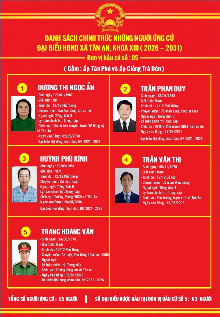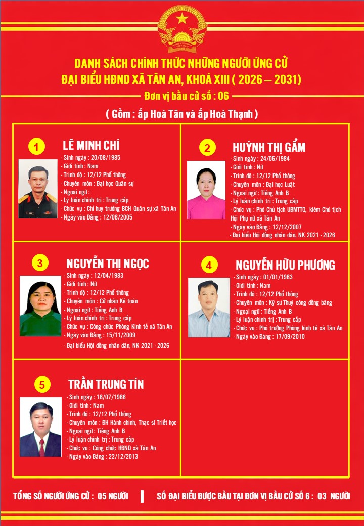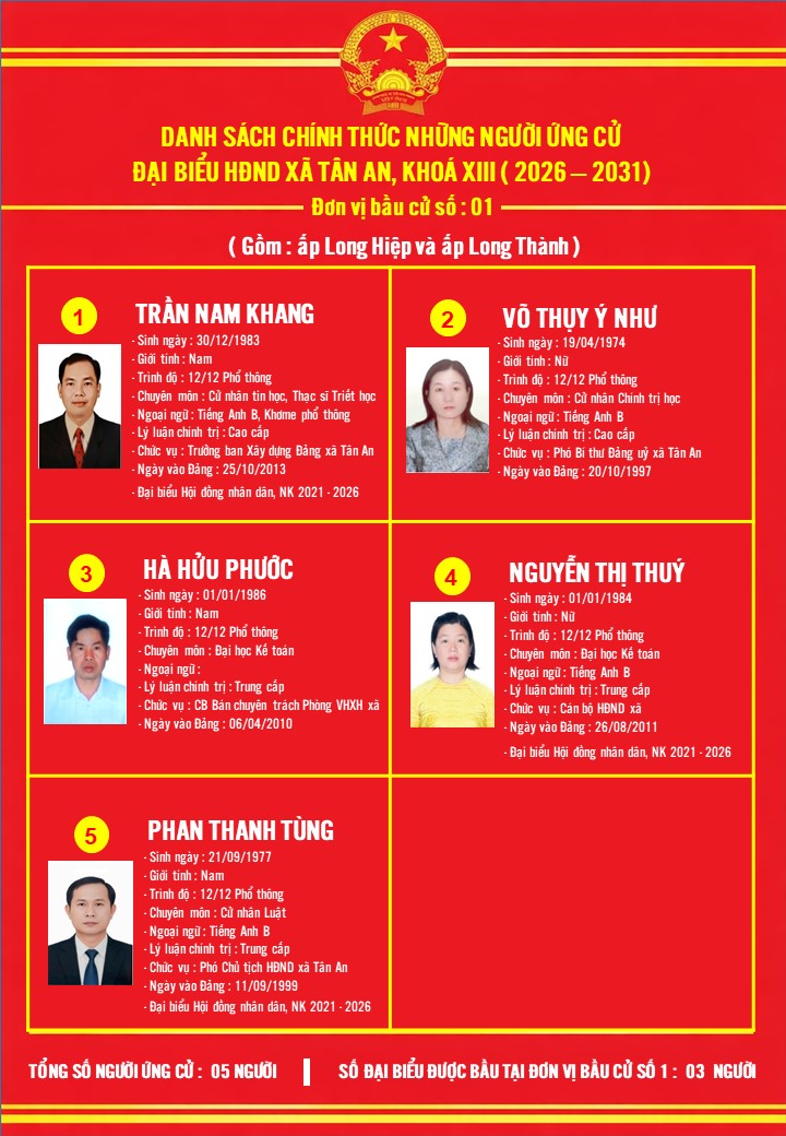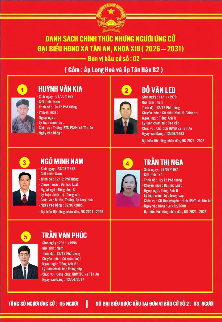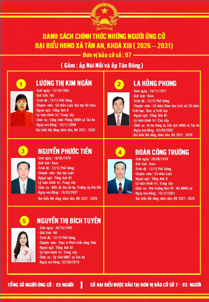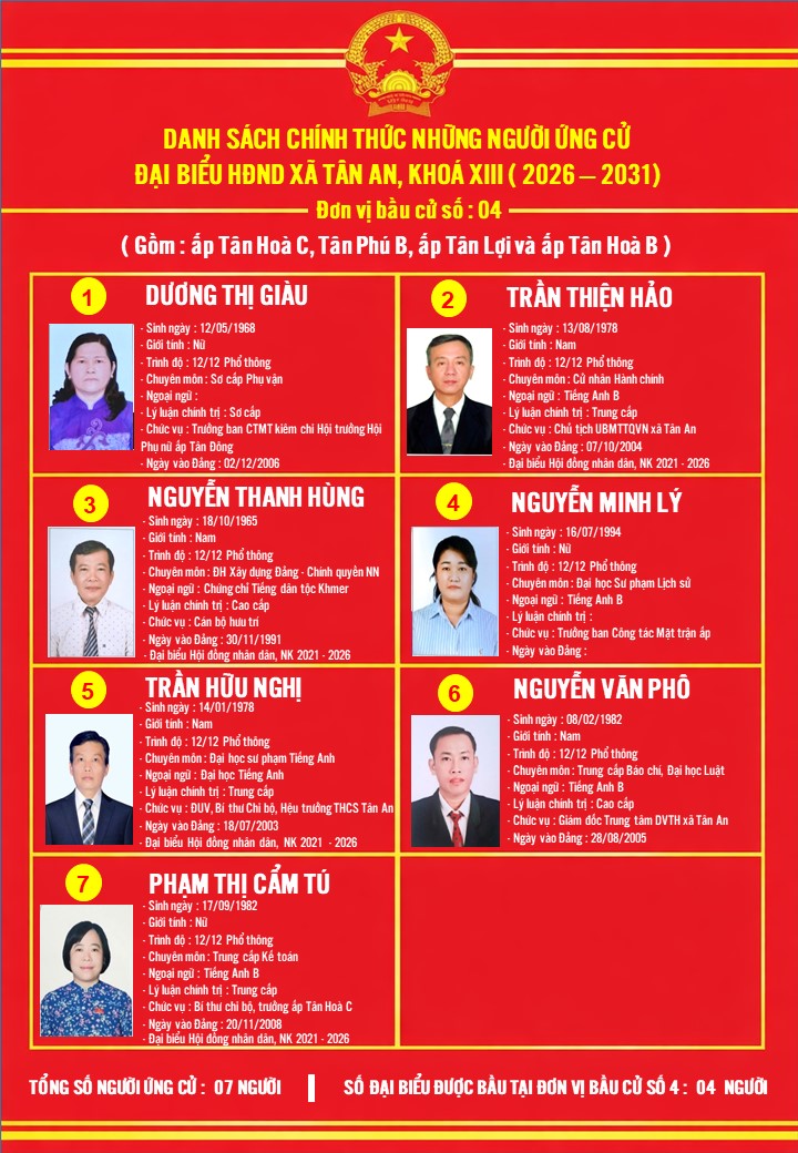 DANH SÁCH NHỮNG NGƯỜI ỨNG CỬ ĐẠI BIỂU HĐND XÃ TÂN AN KHÓA XIII, NHIỆM KỲ 2026-2031