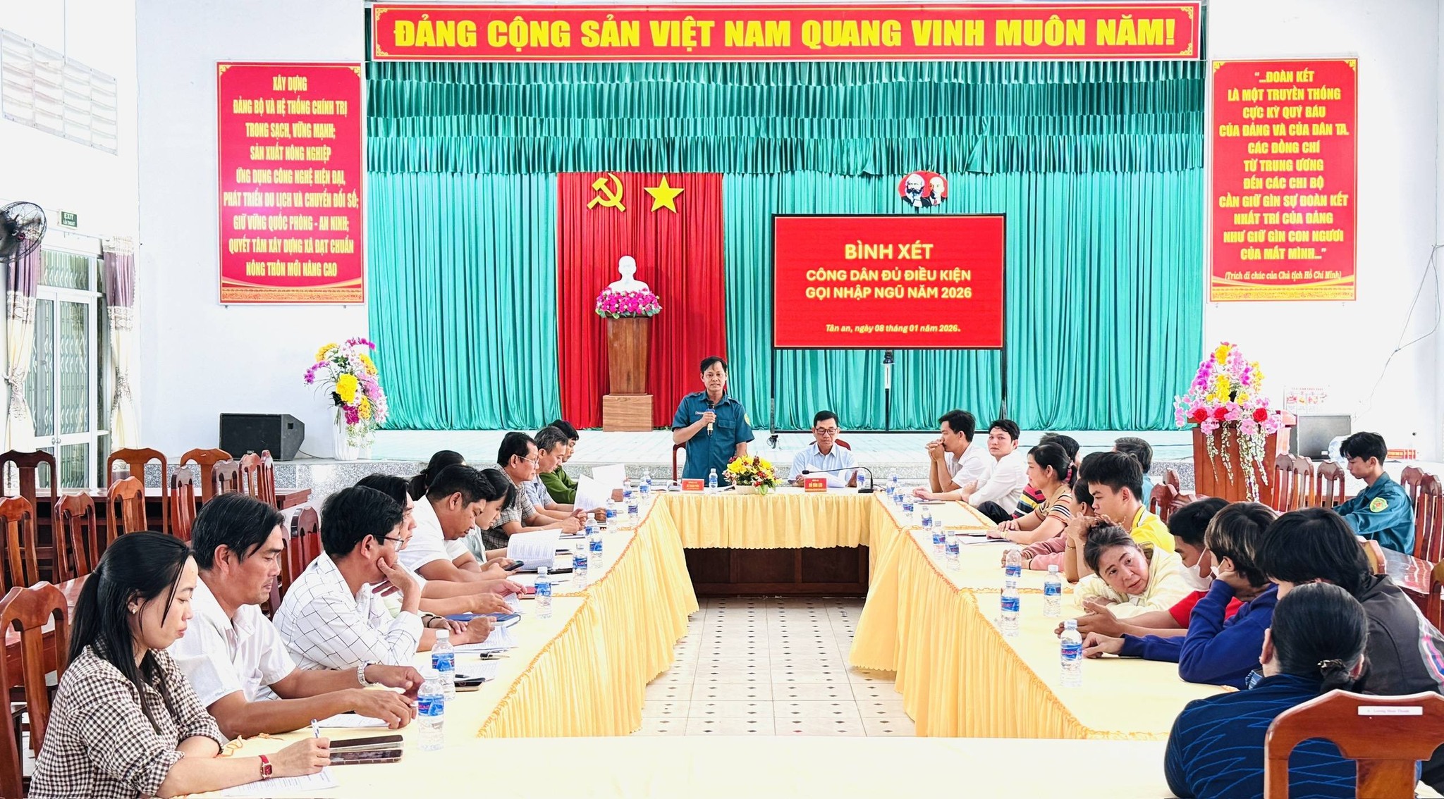 Chiều ngày 08/01/2026, Ông Đỗ Văn Leo, Phó Bí thư Đảng ủy – Chủ tịch UBND xã – Chủ tịch Hội đồng nghĩa vụ quân sự (HĐNVQS) xã Tân An chủ trì buổi bình xét công dân đủ điều kiện nhập ngũ năm 2026 ở các ấp Long Hiệp, Long Thành, Long Hòa và Tân Hậu B2. Cùng tham dự có các thành viên Hội đồng Nghĩa vụ Quân sự xã; lãnh đạo các ban, ngành, đoàn thể xã, các ấp, gia đình và thanh niên.