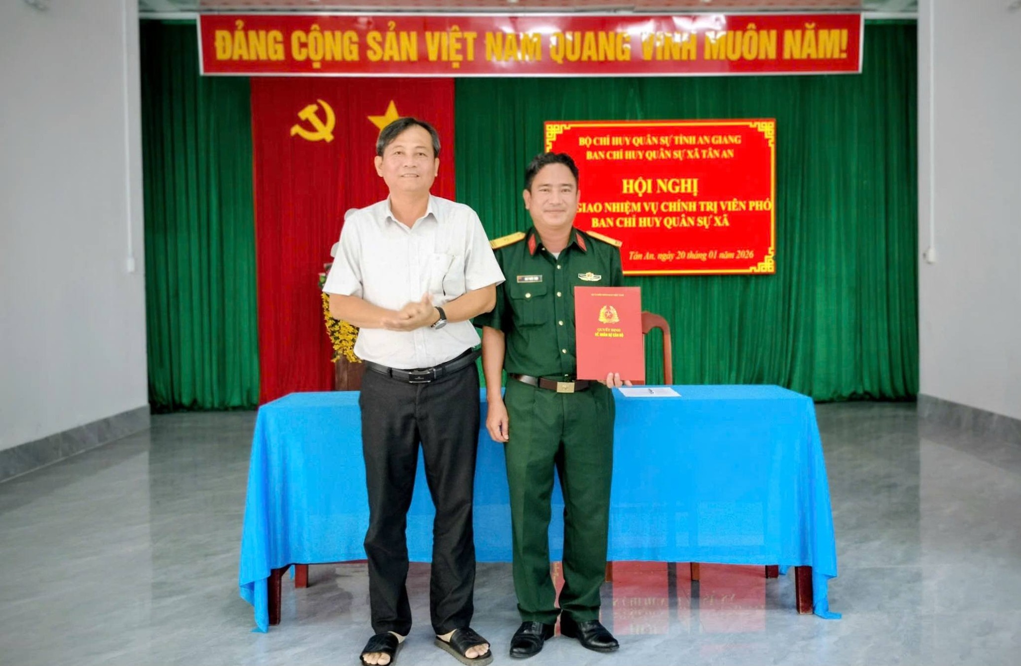 Hội nghị công bố Quyết định và trao Quyết định về việc bổ nhiệm Chính trị viên phó của Bộ Chỉ huy quân sự tỉnh An Giang; ký biên bản nhận nhiệm vụ Chính trị viên phó, Ban Chỉ huy quân sự xã Tân An đối với Thiếu tá Ngô Phước Thiện, Ban Chỉ huy phòng thủ khu vực 1 – Long Phú.