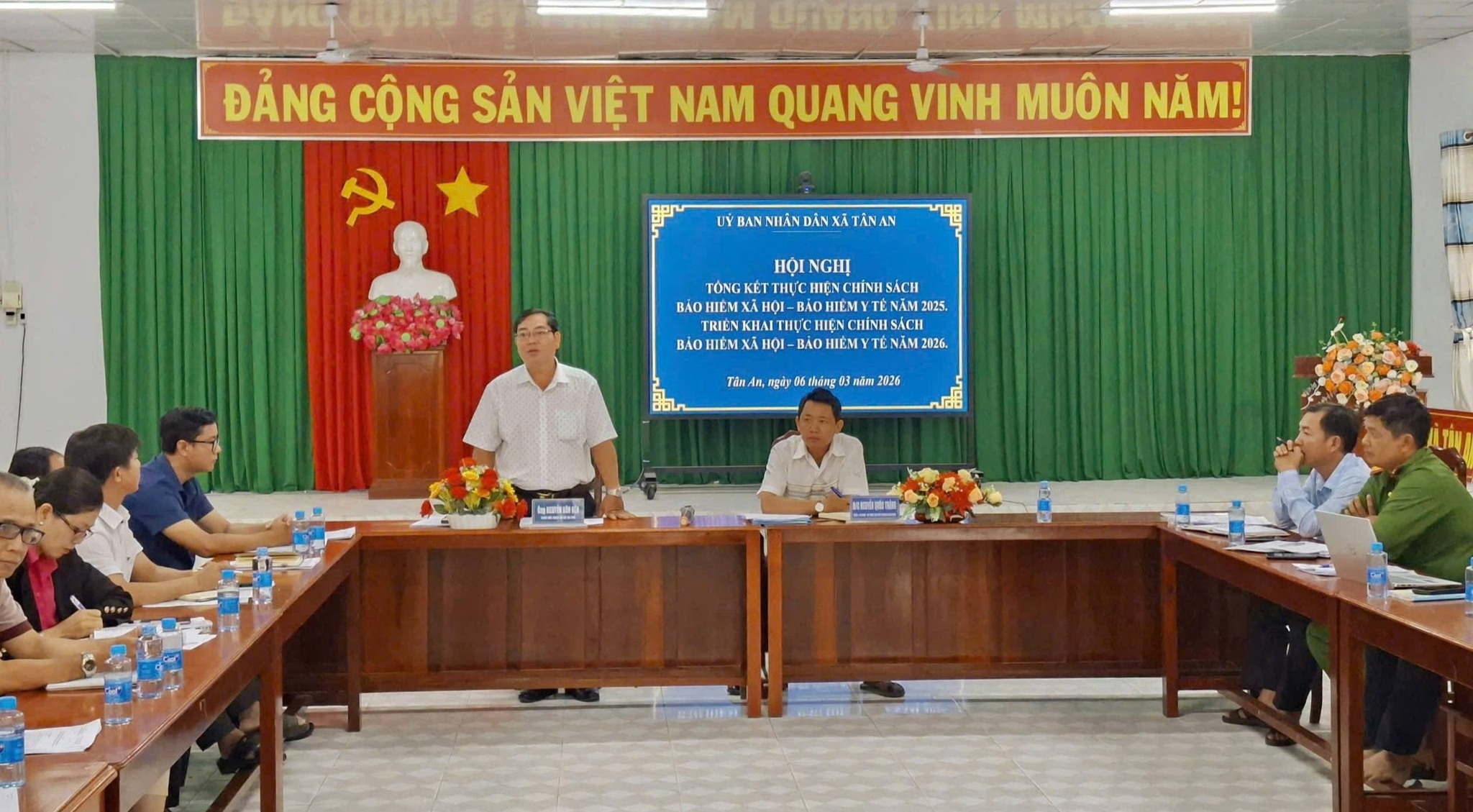Chiều ngày 06/3/2026, UBND xã Tân An phối hợp với Bảo hiểm xã hội (BHXH) cơ sở An Phú tổ chức Hội nghị tổng kết thực hiện chính sách BHXH – BHYT năm 2025 và triển khai nhiệm vụ năm 2026. Đến dự có ông Nguyễn Văn Nên, Giám đốc BHXH cơ sở An Phú; Ủy viên thường vụ Đảng ủy – Phó Chủ tịch UBND xã Nguyễn Quốc Thắng; ông Huỳnh Phú Kính, Trưởng phòng Văn hóa - Xã hội xã Tân An.