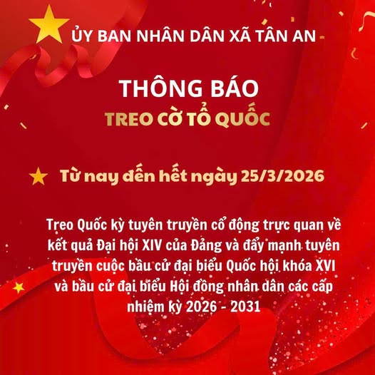 Thực hiện Thông báo số 242/TB-UBND ngày 25 tháng 12 năm 2025 của Uỷ nhân dân tỉnh An Giang về việc treo Quốc kỳ và nghỉ tết Dương lịch năm 2026.