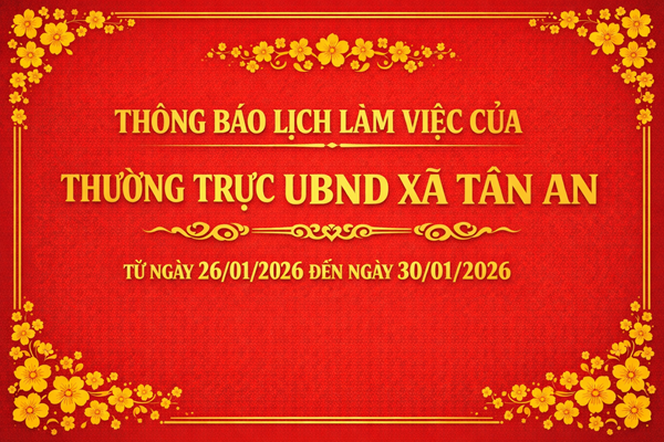 Lịch làm việc của UBND THÔNG BÁO LỊCH LÀM VIỆC CỦA THƯỜNG TRỰC UBND XÃ TÂN AN 29/01/2026 - aA + Submitted by Biên tập viên on 29 January 2026 Tài liệu đính kèm: Lịch lam viec của thường trực UBND xã Tân An TUAN 04 từ ngày 26-01 ĐẾN 30-01-2026.signed.signed.pdf (302.2 KB) Bài viết liên quan THÔNG BÁO LỊCH LÀM VIỆC CỦA THƯỜNG TRỰC UBND XÃ TÂN AN 05/02/2026 THÔNG BÁO LỊCH LÀM VIỆC CỦA THƯỜNG TRỰC UBND XÃ TÂN AN 26/01/2026 Lịch làm việc của Thường trực UBND xã Tân An 08/01/2026 Lịch làm việc của Thường trực UBND xã (Từ ngày 08/12/2025 đến ngày 13/12/2025) 12/12/2025 Lịch làm việc của Thường trực UBND xã (Từ ngày01/12/2025 đến ngày 05/12/2025) 03/12/2025 LỊCH LÀM VIỆC CỦA LÃNH ĐẠO UBND XÃ 16/01/2024