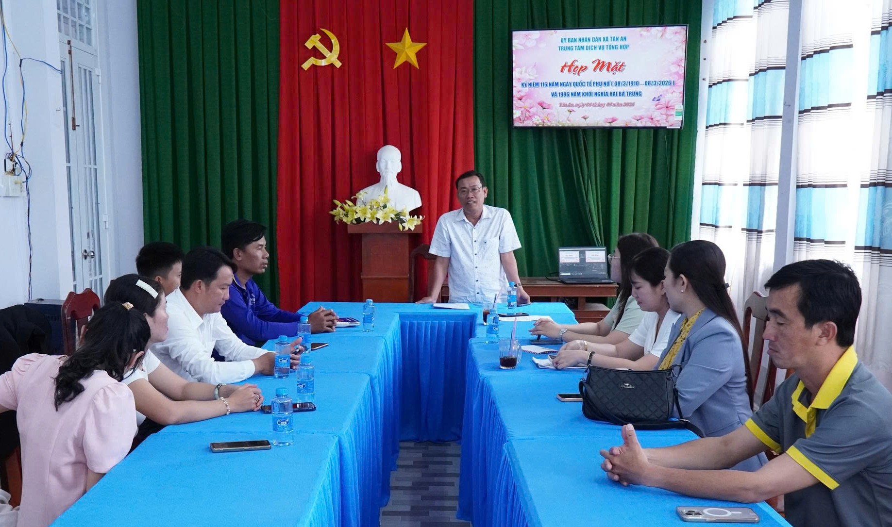 Nhân dịp kỷ niệm 116 năm Ngày Quốc tế Phụ nữ (8/3/1910-8/3/2026) và 1986 năm Khởi nghĩa hai Bà Trưng. Chiều ngày 06/3/2026, Trung tâm dịch vụ tổng hợp xã Tân An tổ chức buổi họp mặt ngày Quốc tế phụ nữ 8/3.